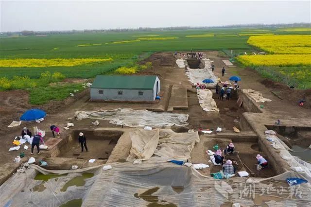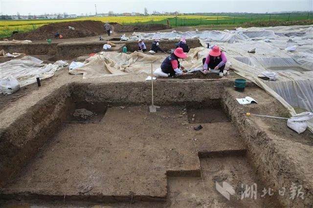 3月的春光正浓,从福银高速转316国道至襄阳市襄州区龙王镇,沿路的油菜花绽放正盛。该镇闫营村村民聚居地东北部几百米开外,极目新闻记者发现,大片油菜花簇拥下的一处高地颇为显眼。大片褐黄色的土壤裸露地表,周围用铁丝网围成一圈。5米长宽的探方整齐划一,一群工作人员或小心翼翼地在探方中一铲铲地掘土,或配合设备分析检测。这里就是凤凰咀遗址发掘现场。
