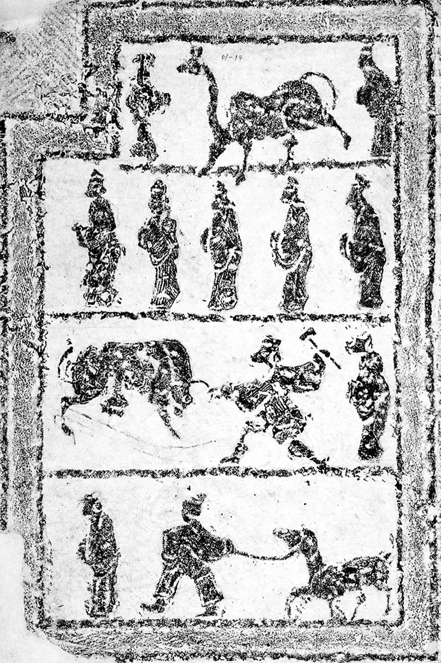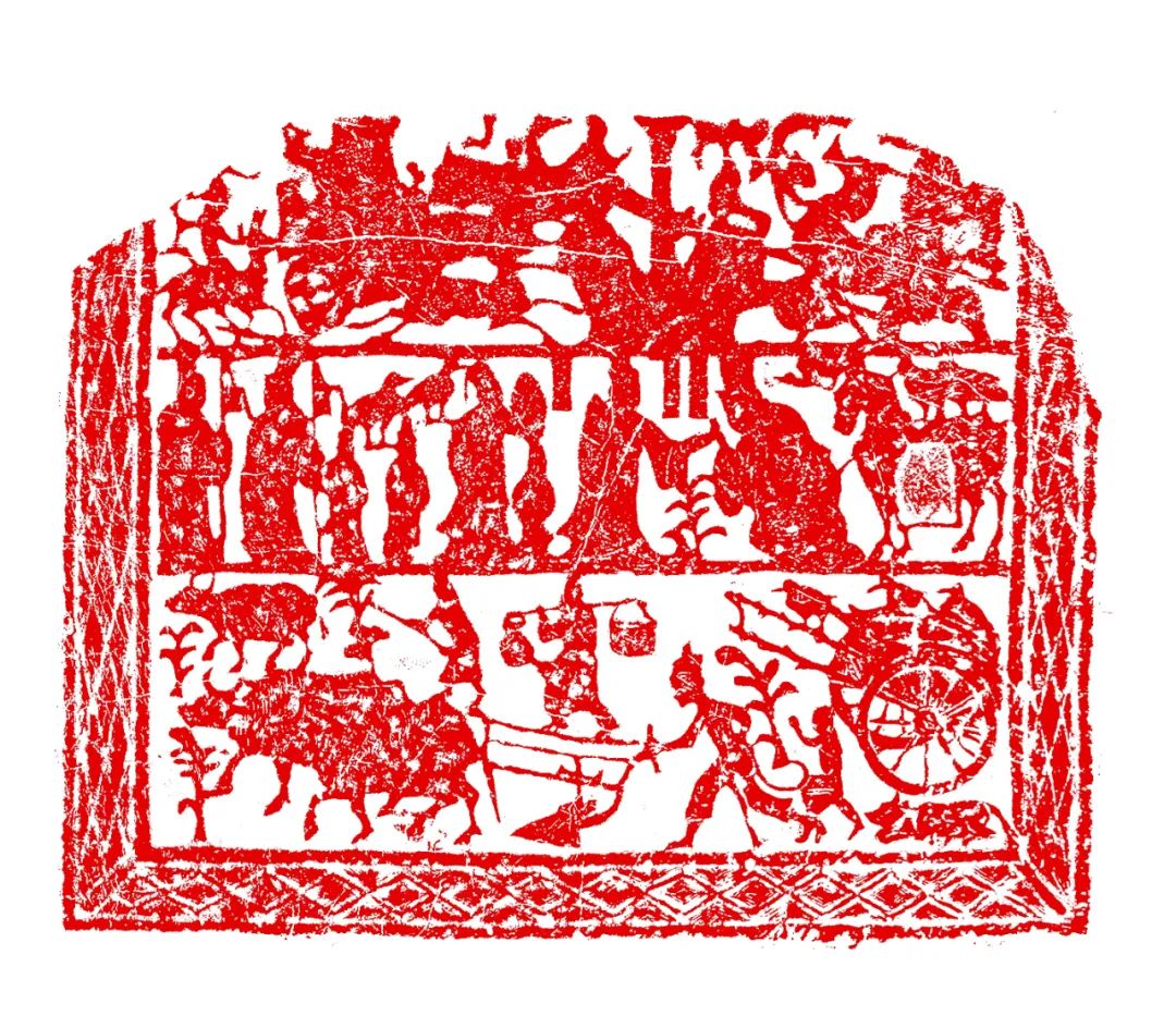 11号石 纵137、横91、厚13厘米。江苏徐州贾汪北部地区出土。浅浮雕。画面分为四层。一层刻一人手牵骆驼,一人拱手相送;二层刻五人,拱手束立;三层一人椎牛,一侍者;四层刻二人、一马,其中后面一人牵马。