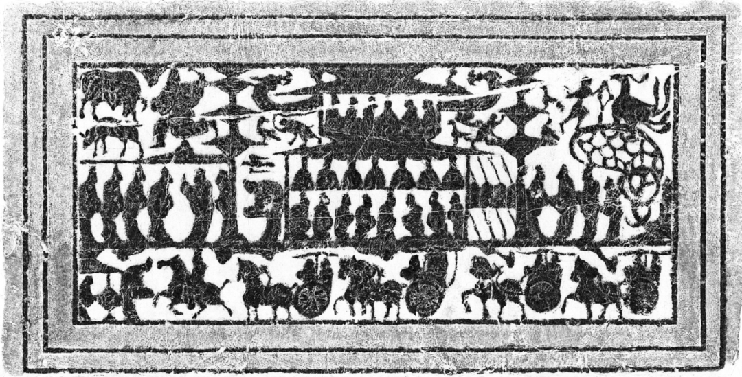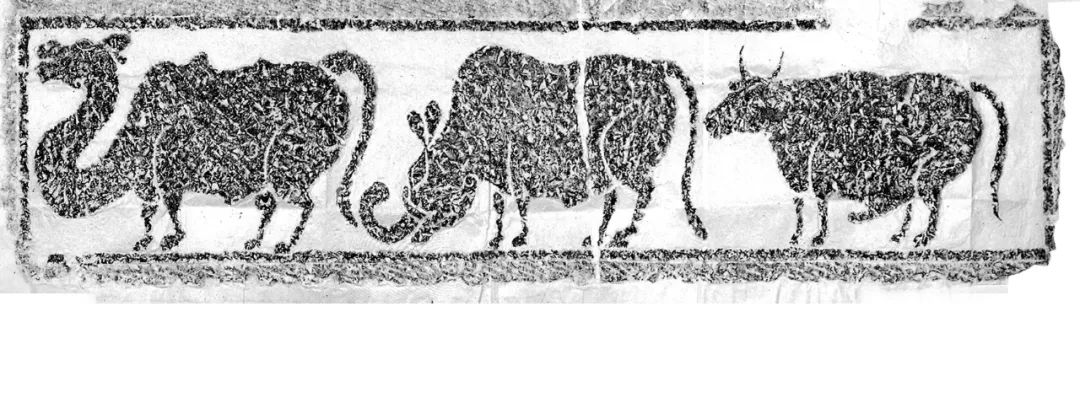 2号石 纵60、横266、厚14厘米。江苏徐州贾汪北部地区出土。浅浮雕。画面自左向右,框内分别依次刻有骆驼、大象和牛。