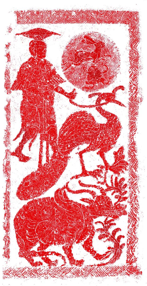 3号石 纵105、横54、厚10厘米。江苏徐州铜山县苗山汉墓出土。阴线刻。画像为炎帝升仙图。画面上方刻一月轮,中有玉免、蟾蜍,旁刻炎帝引凤升仙。炎帝头戴斗笠、身披蓑衣、手持木锸。史载:“以火德王,故号炎帝,作耒耜,故曰神农。”炎帝还是药神,图下部刻神牛衔灵芝草药。