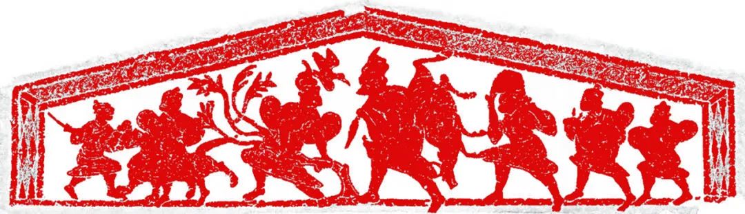 4号石 纵146、横116、厚13厘米。江苏徐州贾汪北部地区出土。浅浮雕。画面分为两层。上层刻三人,前面一人头戴鸡形冠,身后一人躬立,一童一手举竿,一手执物;下层刻鸡首、牛首神人相对。边饰菱形纹、幔纹。