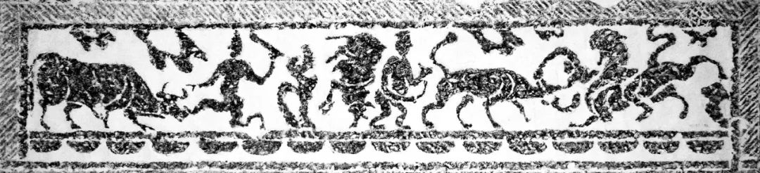 7号石 纵50、横229、厚20厘米。江苏徐州贾汪北部地区出土。横梁。画像为斗牛图。有一武士手按牛角,一手举大锤,朝牛头上打击;另一武士肩背一头牛;右侧一武士骑虎斗兽。边饰斜剁纹。
