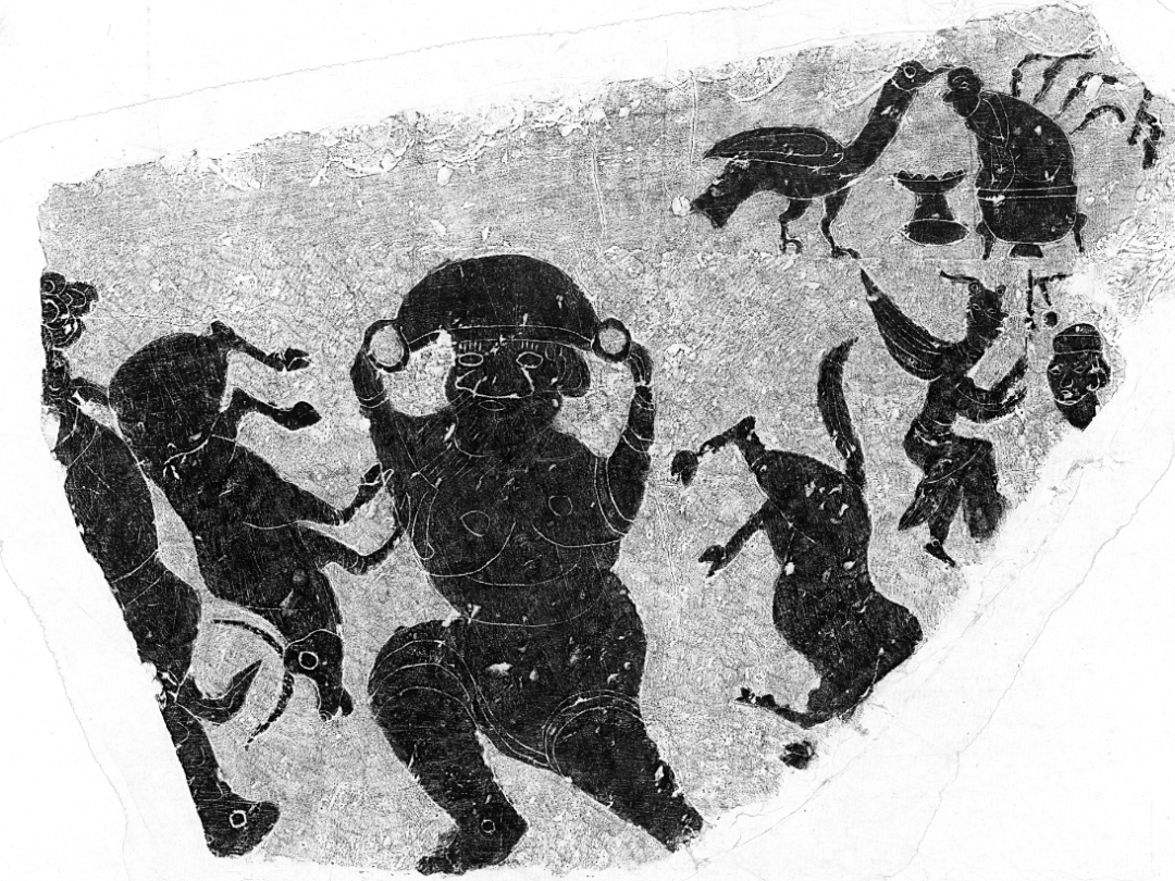 6号石 纵63、横232、厚42厘米。江苏徐州铜山洪楼汉墓出土。画像为力士图。图刻七力士,身着短衣,头戴武士冠,插有雉羽。一武士怒目圆睁,举鼎过首;有背牛、倒拔杨柳,另一武士擒缚一虎,旁观者抱着美酒羔羊,似为得胜者之奖酬。