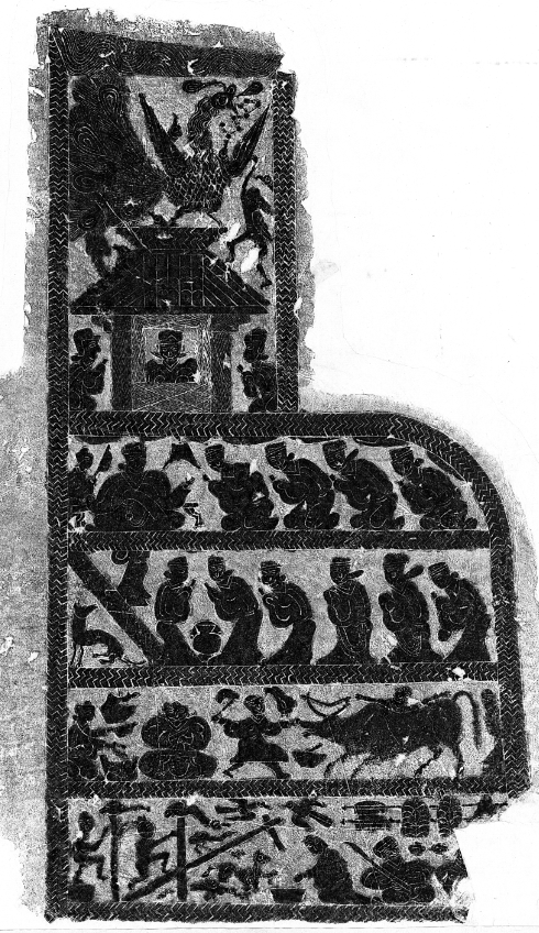 5号石 纵77、横75、厚27厘米。江苏徐州铜山县汉王东沿村出土。画像为西王母仙界图。画面分四层:一层为西王母故事,其中刻有牛首神人、马首神人,上有题榜,有“乐舞君”“主簿”“门下卒”等榜题,二层刻人物拜谒图;三层刻乐舞图;四层刻人物画像。