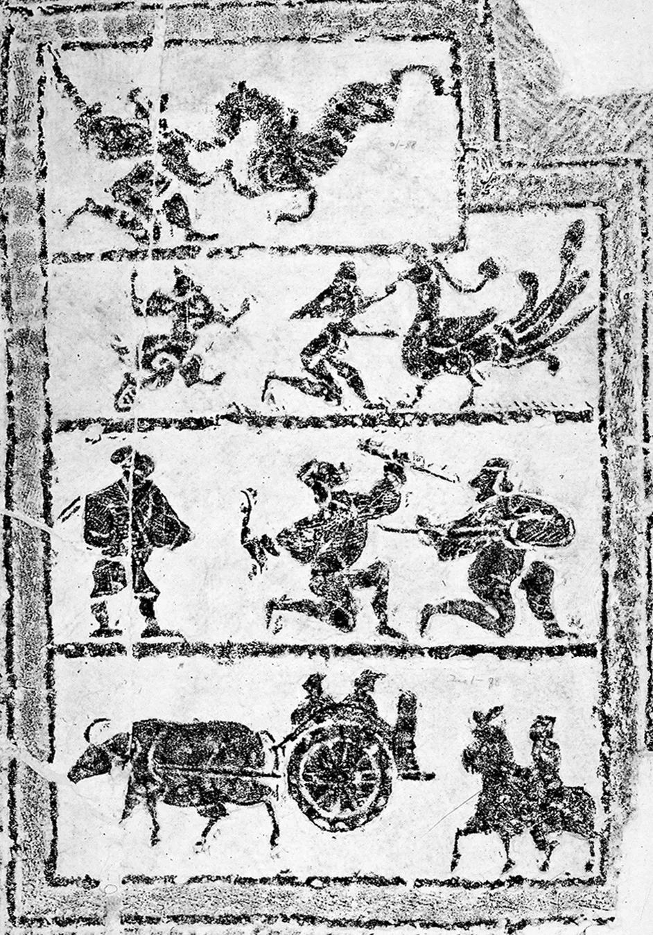 12号石 纵135、横95、厚12厘米。江苏徐州贾汪北部地区出土。浅浮雕。画面分为四层。一层刻一人持棒击虎。二层刻右面为羽人饲凤,左为一兽手舞足蹈。三层刻二人比武,一人观看。四层刻一牛拉车,一骑吏。