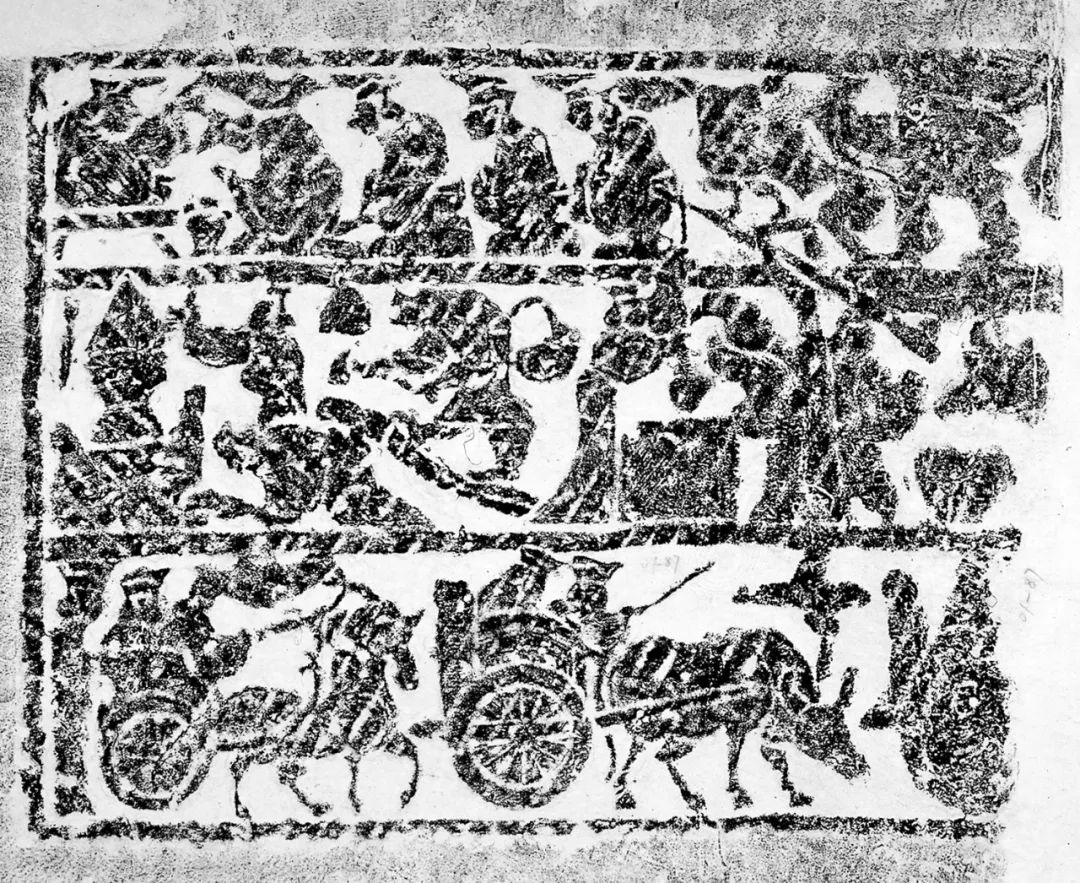 13号石 纵67、横79、厚22厘米。江苏徐州贾汪北部地区出土。浅浮雕。画面分为三层:上层左侧刻一人右向端坐于榻上,前有四人向其跪拜。中间刻庖厨图;有汲水者,有烧水做饭者。下层刻牛车、轺车出行图。