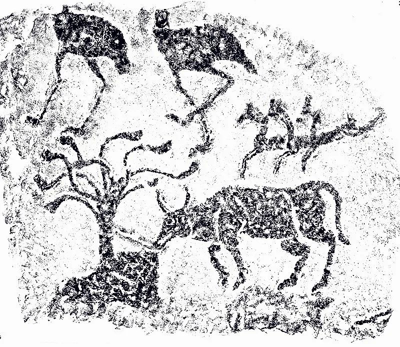 在神话传说中及对牛的崇拜首先表现在第3、4、5号石中刻有肩生双翼的牛首神人,还有神农氏炎帝和一肩生羽翼的神牛。在《山海经》中神农氏炎帝就为“人身牛首”,《 史记·五帝本纪》正义引《帝王世纪》曰:“神农氏,姜姓也,母曰任姒……游华阳,有神龙首,感生炎帝。人身牛首,长于姜水。”《竹书纪年》云“神农人首牛身。”神农氏炎帝作为始祖神和农业之神,传尝有丹雀衔九穗禾,其拾落地者植,食者老而不死,又为医药之祖。有学者认为[iii]牛曾是远古的氏族图腾神,在农耕中而逐渐演变为农神,是我国古代对耕牛崇拜观念在神话领域内的一种形象化反映。汉代人们崇拜牛,把牛奉为神灵,为翼牛。在《西山经》里有类似两河流域艺术里的“翼牛:飞兽之神”的说法。又如《山海经·西山经》西次二经中是这样描写的:“凡西次二经之首、自钤山至于莱山,凡十七山,四千一百四十里。其十神者,皆人面马身,其七神,皆人面而牛身,四足而一臂,操杖以行,是为兽之神。”而在西亚“翼兽”中表现最多的是长翅的狮和牛。雷奈·格鲁塞说:“牛身人面的所谓‘克鲁比姆’(kherubim),这种怪物后来亚述人曾予以充分的发展。但早在拉伽什和阿伽徳时代即已经成为定型了”[iv]。“翼兽”又是西亚艺术的母题或“特征”,所以在外来文化影响下,到中国以后,对牛的崇拜自然就有了理想的境界并得以充分的发展。