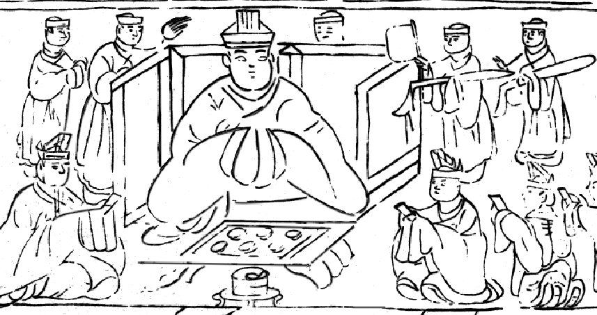 1978年,山东诸城县博物馆在该县凉台村发现一座东汉晚期的画像石墓,由石刻题铭“汉故汉阳太守青州北海高密都乡安持里孙琮字威石之郭藏”知墓主为汉阳太守孙琮,墓室画像中有一幅“拜谒议事”画像,纵151、横75厘米,下面部分为庭院的三层楼阁,刻众多人物在楼内议事,其中走在榻上,身前有凭几、身后有屏风的人物即为太守孙琮的画像(图3)。
