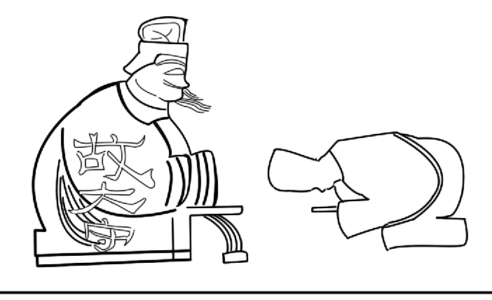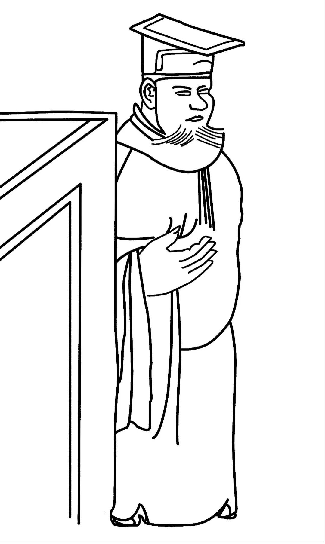 山东金乡朱鮪祠堂是一座原保存完好的祠堂,祠堂内刻有祠主身前生活的场景,在4号石横枋下面,站立一位男子,气宇宣扬的站立,长须虬髯,头戴爵弁(图5),旁边有“朱长舒之墓”题刻,有学者认为此为祠主肖像,也有学者认为是一个武职的门吏,朱鮪祠堂为祠主缺位的画像。从该人物的形象及服饰来看,是整个祠堂画像中身份最高的人物,其旁又有铭文题刻,因此很有可能是祠主的肖像。