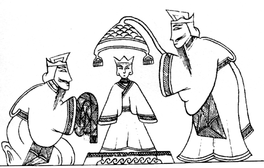 画像石中的先贤像主要是周公辅成王、孔子见老子。周公辅成王是一幅有政治意义的叙事画像,《孔子家语·适周篇》记载, 孔子曾在明堂见到过周公辅成王的画面:“又有周公相成王, 抱之负斧扆,南面以朝诸侯之图焉”。汉武帝专门赐画“周公辅成王”给霍光。在“周公辅成王”的画像中,“华盖”、“王冠” 是一种图像符号,是“成王”身份的象征。嘉祥武氏祠左石室中的周公辅成王就是以图像符号确定肖像画人物的特殊身份(图8)。在这类题材中,画家强调的是人物的特殊象征“符号”和人物之间的“正确”关系,“这种关系不仅是物理方位上的,更是政治伦理上的”。