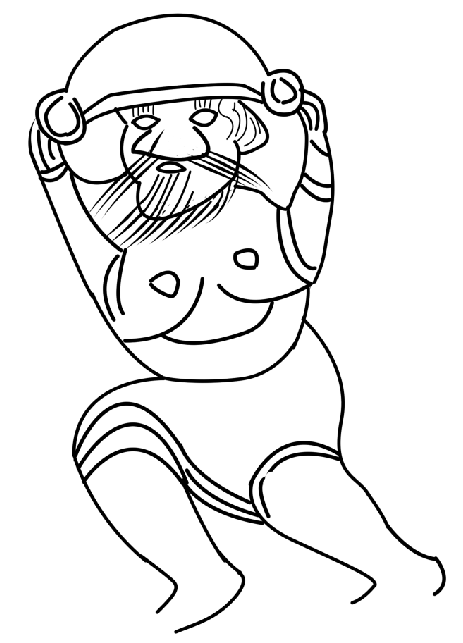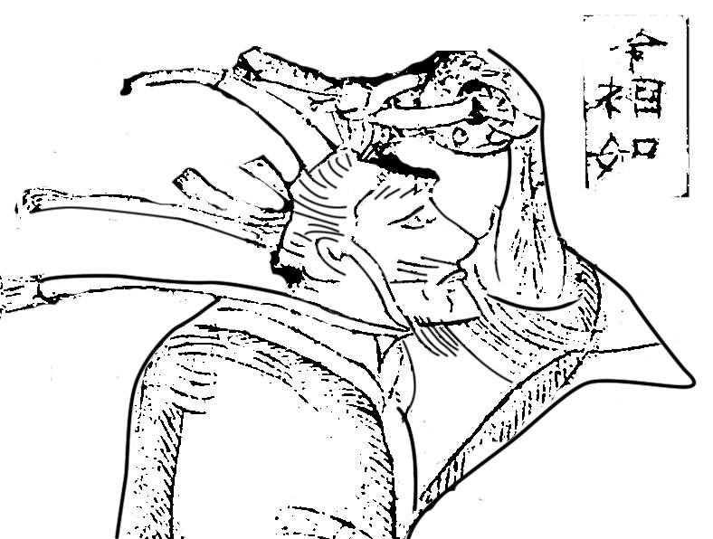 汉画像石中勇猛武士的肖像都有夸张的描写。如武士孟贲为秦武王时力士,《史记·秦本纪》:“武王好多力之人,齐孟贲之徒并归焉。孟贲生拔牛角。”孟贲最后是“举鼎绝膑死”。孟贲与成荆、王庆忌、夏育皆力大无比,成为门神画的原型。《淮南子·说林训》云:“ 规孟贲之目,大而不可畏,君形者亡焉。”意思是说画孟贲的眼睛不仅要大,而且要有神。沂南北寨画像石中的孟贲像浓眉圆目,阔口方鼻,长须虬髯,给人以望而生畏的感觉(图11)。徐州汉画像石中有孟贲举鼎的画像,孟贲宽阔的鼻梁,长长的须髯,显然是夸张的描写(图12)。