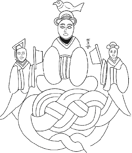 汉画像石中的西王母有显著的肖像画特征。成熟期的西王母肖像一般是“偶像”式图像,其特征是头戴胜饰,凭几而坐,拥有华盖,《山海经·海内北经》记载的“西王母梯几而戴胜杖”是西王母肖像创作的文本依据。不过《山海经》记载的西王母是“豹尾虎齿”半人半兽的样子,画像石中的西王母像显然是一位漂亮的妇人形象。《汉武内传》西王母的形象是“文采鲜明,光仪淑穆”,“头上太华髻,戴太真晨婴之冠……。视之可年三十许,修短得中,天姿掩蔼,容颜绝世。”尽管《汉武内传》托名班固所著,后人认为书年代应当是魏晋时期,但是王母的故事受着东汉以来人们传说的影响,描写的西王母应该是当时人们心目中的形象。山东微山两城镇出土的西王母画像石,图中西王母正面端坐,高冠,冠上有一鸟,左右肩各出祥云一朵,男女侍者分在左右,西王母右侧刻有铭文:“西王母”,这是汉画像石中西王母的最漂亮的肖像画(图15)。