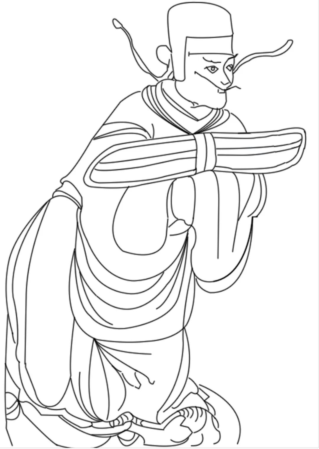 唐代张彦远《历代名画记》引顾恺之的话说:“画人最难,次山水,次狗马。”画人难的原因是人物画有严格的比列标准,肖像画更需要掌握人体的结构比列。汉代肖像有准确的人物造型,五官比例和谐,“立七坐五”、“三庭五眼”作为身高、五官与脸形相搭配的美学标准在画像中就可以看出。例如:安徽亳州董园村东汉甬道北壁亭长画像(图19),其面部、眼睛、鼻子、嘴、胡须刻画细腻清晰,头部和身体比例约为1:7,比例协调;身体前倾,形态自然从容、庄重,抱盾应是恭迎宾客,衣服褶皱用工笔画线描形式勾勒,线条流畅、飘逸,虽然衣服包裹于身,刻绘者所表现出此肖像的“头、面、手、足、胸、臆、肩、背,无遗失尺度。”