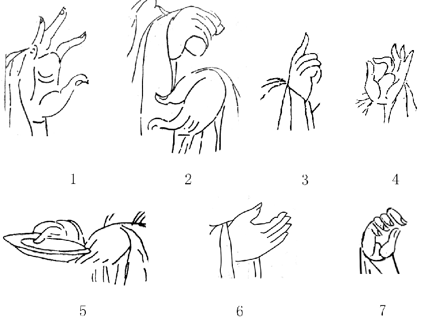 肖像画除了人物面部的表情是重点表现的对象外,人物的手势、衣冠服饰也是表现人物个性的辅助手法。“画人难画手”,手姿是表达感情的重要手段,面部表情是由五官的变化而来的,手的“表情”是靠手指的姿势设定的。画像石中的人物肖像非常重视“手姿”的刻画,如:金乡朱鮪祠堂、沂南北寨画像石墓、密县打虎亭一号墓中的人物画,手姿样式多样,手指的关节和指甲都刻画出来,表现出画师对细节的观察和写实的能力(图20)。