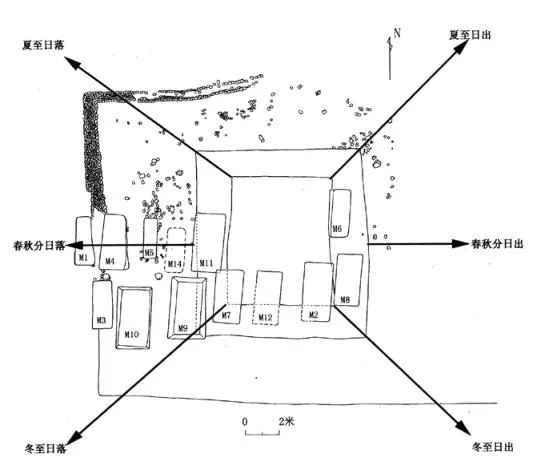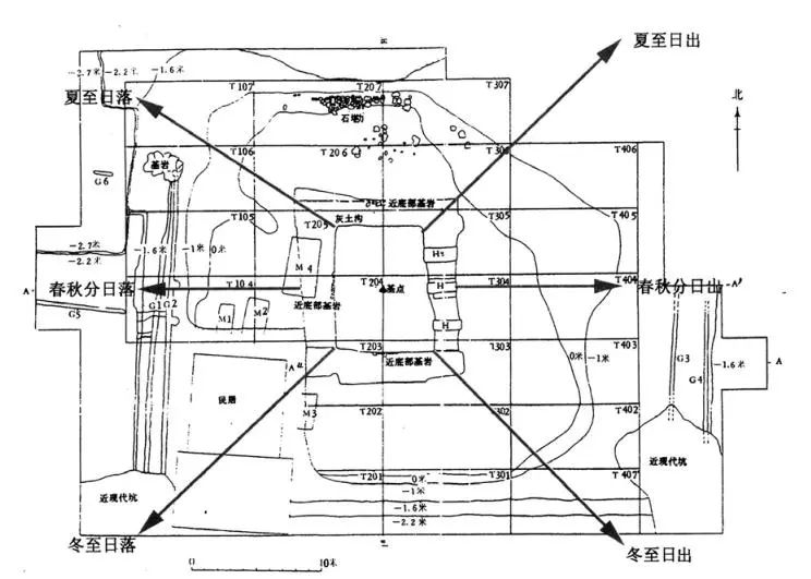 汇观山祭坛形制与瑶山祭坛十分相似,建于山顶,平面基本为长方形,中部偏西的位置以挖沟填筑的方式筑祭坛中心,平面亦呈“回”字状的内外三重的形式。汇观山祭坛西南部发现清理了 4 座良渚文化大墓,其中 M4 打破了祭坛灰土方框的西边,破坏了祭坛的原有格局。1999—2001 年,为复原和展示汇观山遗址,考古工作者对汇观山祭坛的主体部分进行复原性保护。期间,浙江省文物考古研究所刘斌研究员在祭坛的中心竖立起标杆,测量日影的变化和日出日落的方位。经过两年多的观测与思考,发现祭坛原初的设计应该是用来观测太阳方位进行测年的场所。