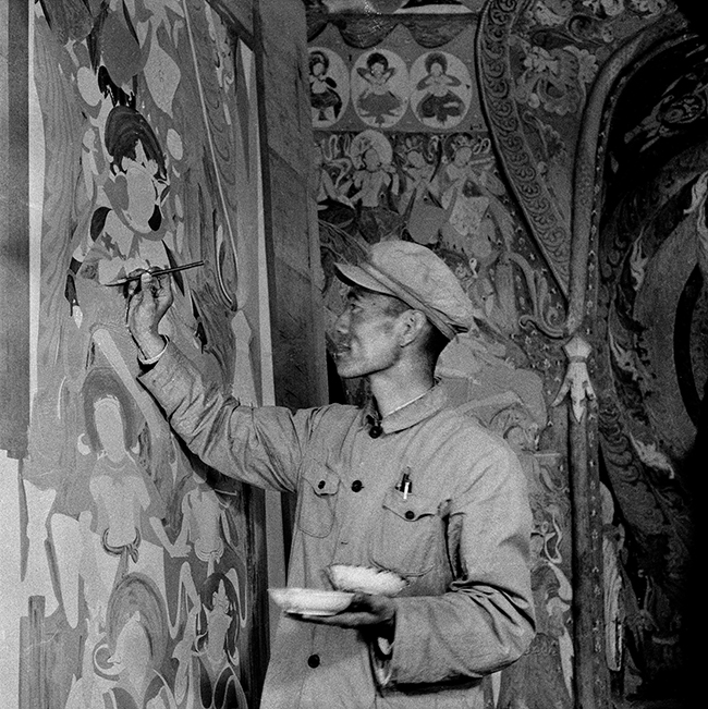 丰饶迷人与荒芜贫瘠是并存的。那时候,敦煌生活的艰辛是现在人无法想象的,晚上看书,只能就着昏黄摇曳的煤油灯,喝水要到莫高窟前的宕河提水,宕河没有桥,除了冬天结冰,平时都涉水过河。物资极端匮乏,蔬菜很少,粮食品种单调,而且全部都要用大半天时间到县城购买,当天赶不回来还要在县城住一晚。有一次段先生赶上毛驴想当天从县城返回,抄近道在鸣沙山竟然遇见了狼,那是一种什么样的内功和勇气能与狼对峙?结局是狼沿着一个方向跑开了。冬天风雪像狼一样嚎叫,夜晚必须烧炕才能暖和,段先生白天争分夺秒地抢救临摹壁画、彩塑等,忙到很晚回到住处,根本就没有时间烧炕,加之经济上又拮据,烧炕需要买柴,于是回到住所只有裹紧被子倒头便睡,次日天明起床,段先生都成了圣诞老人了,眉毛 、睫毛、胡子、头发全结冰了!