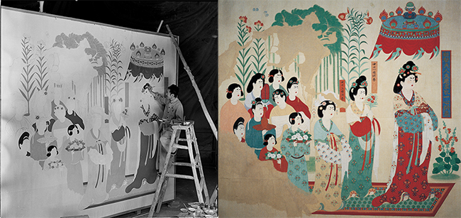 段先生的临摹代表作“都督夫人礼佛图”,是唐代人物画的经典之作,原作的剥蚀很严重,一些关键部位缺损退色,随着时间的推移,完全可能进一步模糊湮灭,临摹这幅画是一次抢救性的保护措施。为了忠实再现这幅杰作的原貌,段文杰先生查阅了大量的历史资料,对原作的人物背景、人物特征、主题思想,画面的组织结构、特定朝代的服饰、人物的精神刻画、艺术风格、原画的制作过程、起稿的程序、人物的晕染方法、线描的的特色、布色的先后,全部做了深入细致的考证研究,完成了这幅画的复原临摹,这是高难度带研究性质的临摹,画面的线条在断了的情况下如何连接,这都需根据查证的资料和根据运笔逻辑日夜揣摩,他常常在睡梦中都会被惊醒,一掀被便拔脚进洞。暮年最后的时光里,敦煌夜夜仍入南柯,段先生半夜经常会从病床上坐起来想要出去,口中嚷嚷的是要进洞子。进洞子研究壁画人物、彩塑已经成为他下意识行为了。