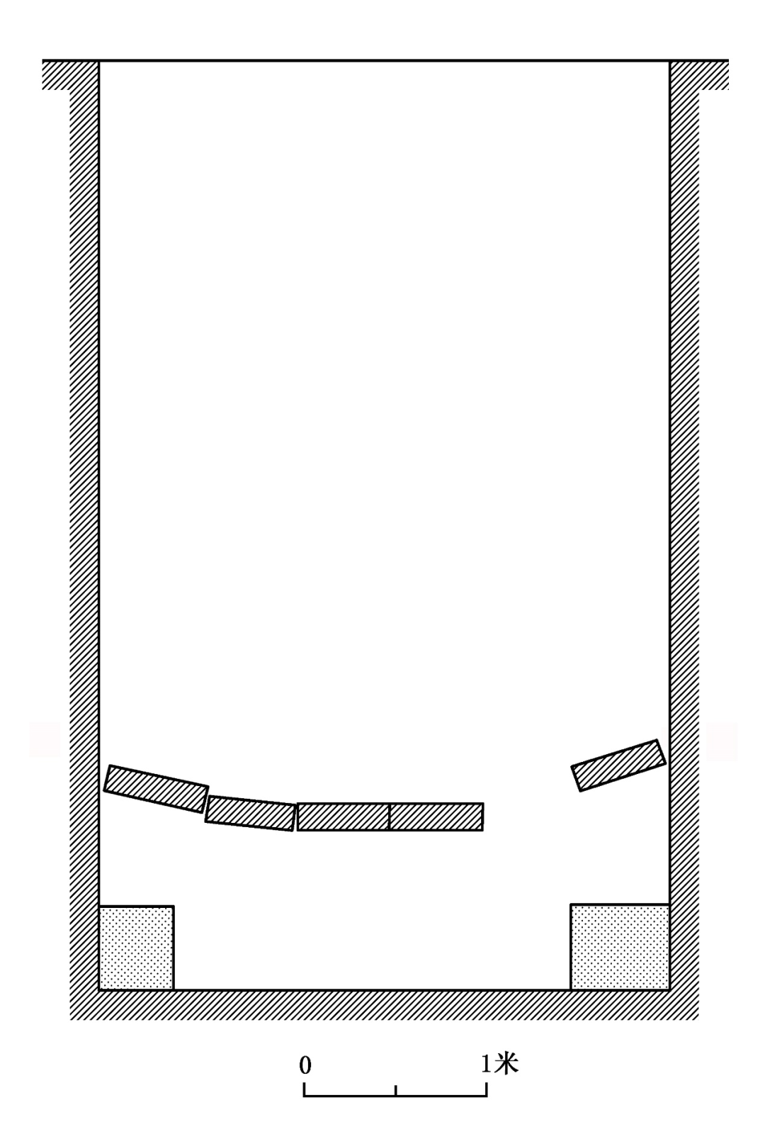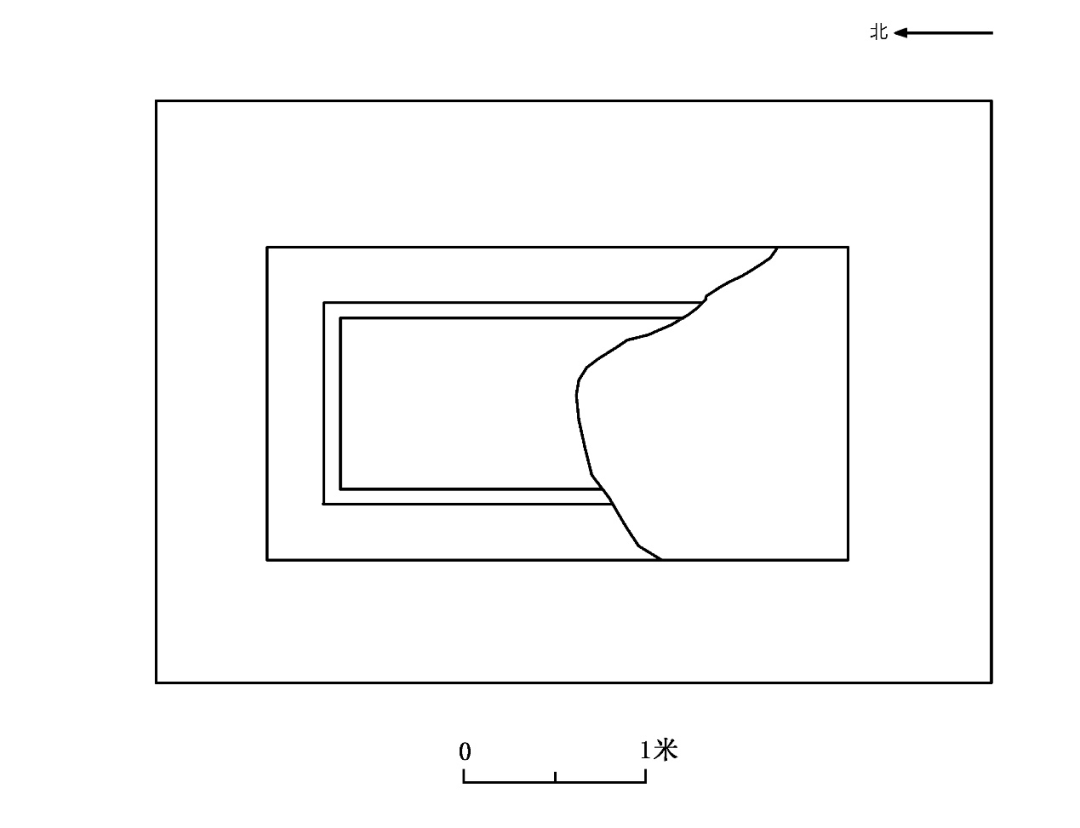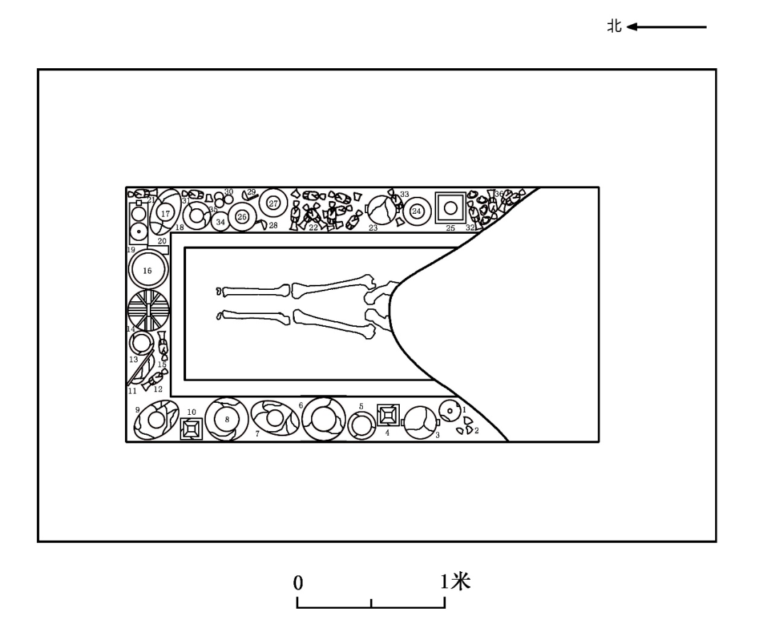 南部被盗扰。棺内有腐朽严重的尸骨1具,除南部被扰动外,其余部分仅见大体轮廓,头向南。随葬品集中放置在二层台和漆棺之间,陶器有鼎、盒、壶、钫、茧形壶、罐、灶、盆、勺及男女陶俑20余件,此外棺西侧有2件石璧,北侧有1件铁钁。