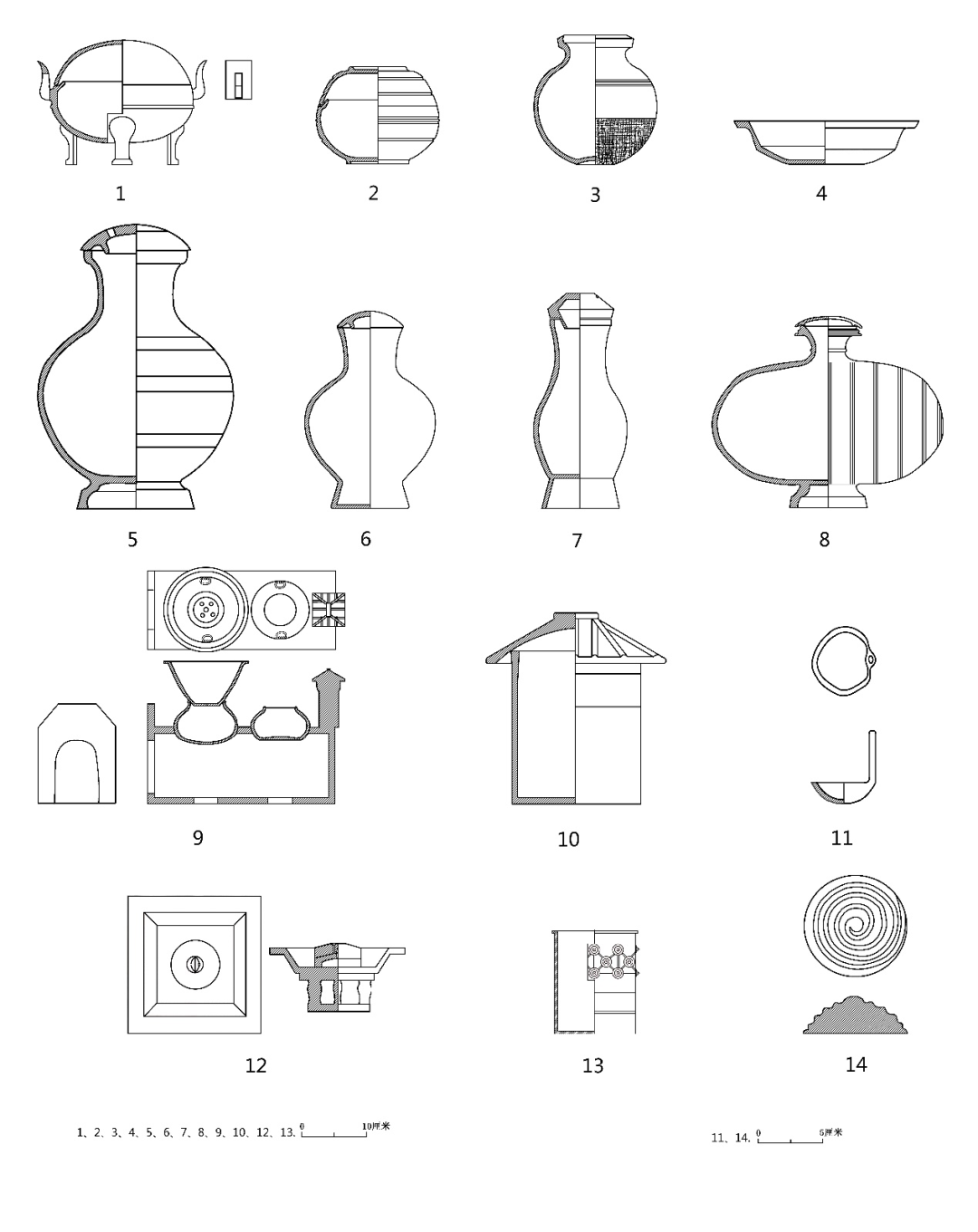 33 件(组),有鼎、盒、壶、钫、茧形壶、罐、鐎盉、灶、盆、勺、磨、井、仓、饼以及男女立俑等。均为泥质灰陶。