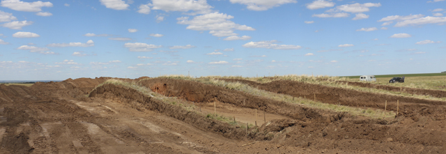 В текущем полевом сезоне было исследовано два кургана (курган 1 и курган 3). Курган 1 (диаметр 60 м, высота 2,8 м) являлся самым большим в группе. В процессе удаления насыпи в центральной части кургана были выявлены обширные участки сильно прокаленной почвы и остатки сгоревшей надмогильной деревянной конструкции. Судя по сохранившимся фрагментам, конструкция над центральным погребением была устроена в виде радиально уложенных бревен. Следы мощного кострища фиксировались в стратиграфических разрезах контрольных бровок, на погребенной почве и на материковой поверхности. Помимо сгоревшей конструкции, в насыпи кургана фиксировался круговой валик диаметром до 33 м, сооруженный из материкового суглинка вокруг центрального погребения.