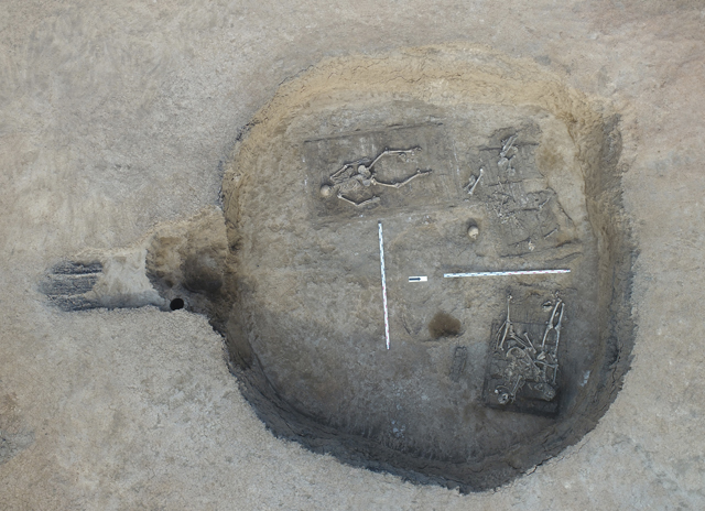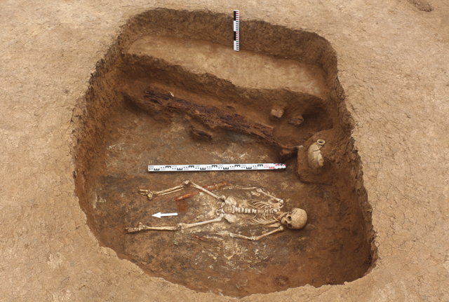 В основе погребальной конструкции кургана 1 находилось центральное погребение с дромосом (погребение 6). В погребении обнаружено коллективное захоронение. В западной части ямы были расчищены остатки деревянного ящика, в котором находился мужской костяк, ориентированный в южный сектор. Были зафиксированы остатки деревянного перекрытия ящика и фрагменты стенок. Дно погребального ящика представляло собой погребальное ложе из хорошо обработанных и плотно подогнанных поперечных плах. В северной части ямы были расчищены еще три костяка, уложенных на погребальные ложа (носилки?) из продольных деревянных плах, скрепленных поперечинами. Из инвентаря в центральном погребении были найдены железный колчанный крюк, бронзовые наконечники стрел и ряд других вещей.