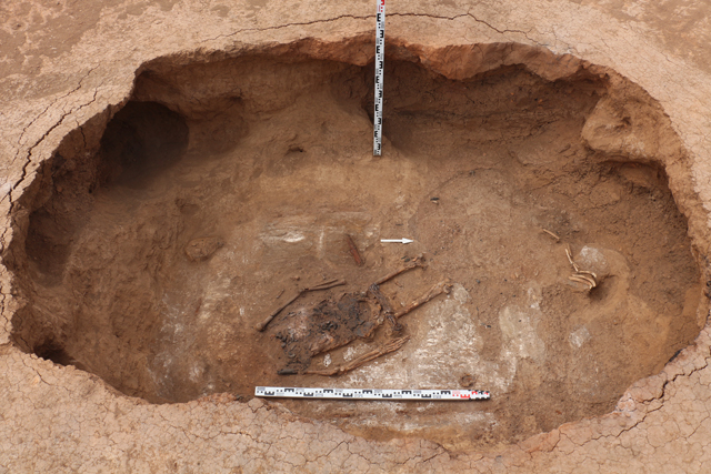 Два погребения были совершены в подбойных ямах за пределами кольцевого валика (погребения 2, 3). В каждом из них был обнаружен костяк подростка. В обоих погребениях при погребенных были найдены железные мечи. Кроме того, зафиксированы остатки деревянных луков скифского типа, уложенных слева от костяков поверх колчанов с бронзовыми наконечниками стрел. Обращает на себя внимание находка гончарной вьючной фляги хорезмийского производства (погребение 2).