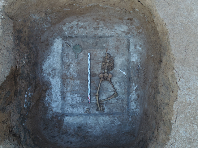 Еще одно погребение (погребение 5) за пределами кольцевого валика было совершено в большой подпрямоугольной яме. По углам ямы фиксировались фрагменты дерева, вероятнее всего, от опорных вертикальных столбов. На дне ямы были расчищены остатки деревянных погребальных носилок, на которых был уложен женский костяк. Из инвентаря в погребении были найдены орнаментированное бронзовое зеркало, округлая пронизь из белого мрамора, железный стилет с характерной проволочной петлей на рукояти.