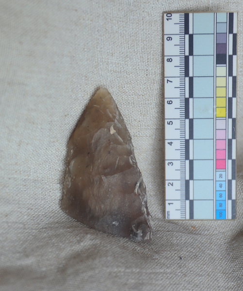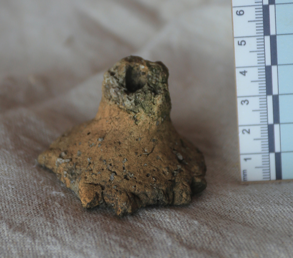 Разведки Рунского отряда обнаружили средневековые курганные группы, городища раннего железного века, не связанные с крупными водоемами. Культурные слои городищ насыщены углистым гумусированным грунтом и многочисленными фрагментами валунных камней со следами сажи, термическими растрескиваниями и разрывами. Найдены немногочисленные фрагменты керамики дьяковской культуры раннего периода (экспертное мнение О.В. Лопатиной), а также одна из «визитных карточек» – пряслице дьякова типа (Рис. 5,6).