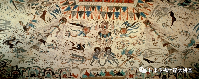 很有意思的是在洞窟里面竟然我们还看到了中国传统神话中的中华人文始祖,伏羲、女娲。