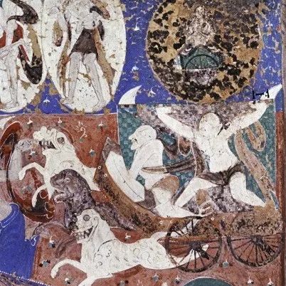 一直到西安碑林博物馆有一个造像碑,有一个就是两匹马背靠背,再也没有。但是在敦煌以西,我们在新疆的克孜尔石窟,我们在印度、在阿富汗巴米扬石窟,像这个就是阿富汗巴米扬东大佛,我们都知道2001年的时候已经被炸毁了。这个照片就是拍于被炸之前,在它洞窟的顶上往下降,图指的那个地方大家就也是一个太阳神。下面剥落了,我们仔细看的话,也是四匹马向两个不同的方向。