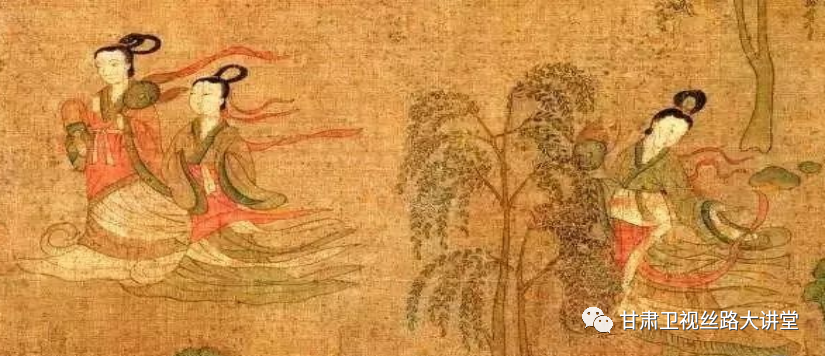 还有左边这个洞窟画的女供养人,我们看到她的衣服也是后面飞削飘扬,间色长裙拽地托起,衬的她的身体非常轻盈,而这种表达方式我们在东晋的顾恺之的《洛神赋图》的洛神形象上也可以看到,我们看到右面这个洛神,她的后面衣带也是飘举。