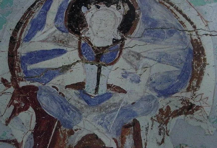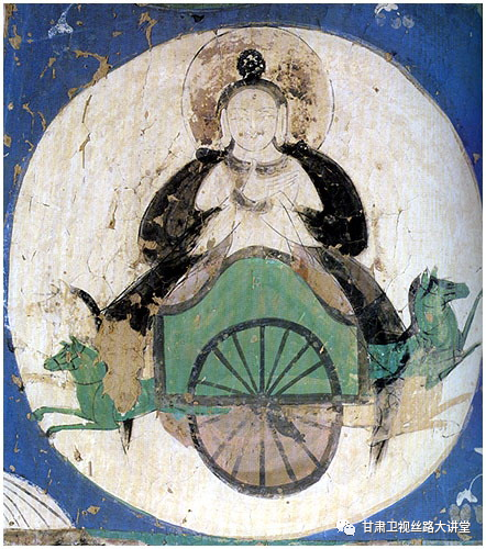 我们再来看看这个神灵形象。前面我讲了洞窟中它有佛、菩萨、护法神。这个护法神我们现在看到的就是正壁的最上角南北两端的日天和月天。我们知道,关于日月的神话是任何一个民族中、任何一个文明形态中都是永恒不变的话题。同样佛教文明也是这样,把这些东西就纳入了它的佛教的神灵体系中。