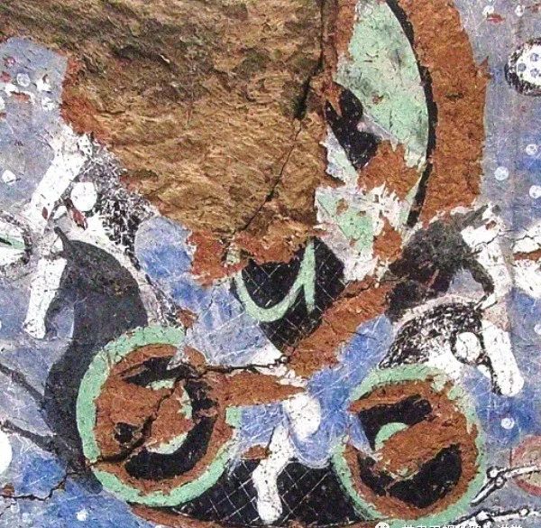 我们再看月神的时候,骑着4只天鹅拉的这个车的月神。虽然我们看到它画面已经斑驳了,但是我圈起来那个地方大家仍然可以看到有羽毛的羽毛尖。完整的图片别的地方有。就说这样的话,我们判断它原来也是四只天鹅拉的这个图像。