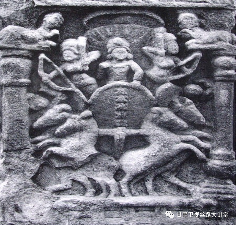 所以之前学术界认为敦煌的285窟,很明显,你看又有湿婆神,又有毗湿奴,又有苏利耶,所以认为直接从印度教,从印度过来的。但是我认为我们先打个问号,285窟的图像是不是直接从那儿来的呢?虽然我们在印度就看到日神苏利耶它也骑4匹马,但是我们还会看到比它更早的,像公元前5世纪,这是公元前500年,公元前6世纪,公元前500年的这个图就比刚才我们苏利耶要早500年。