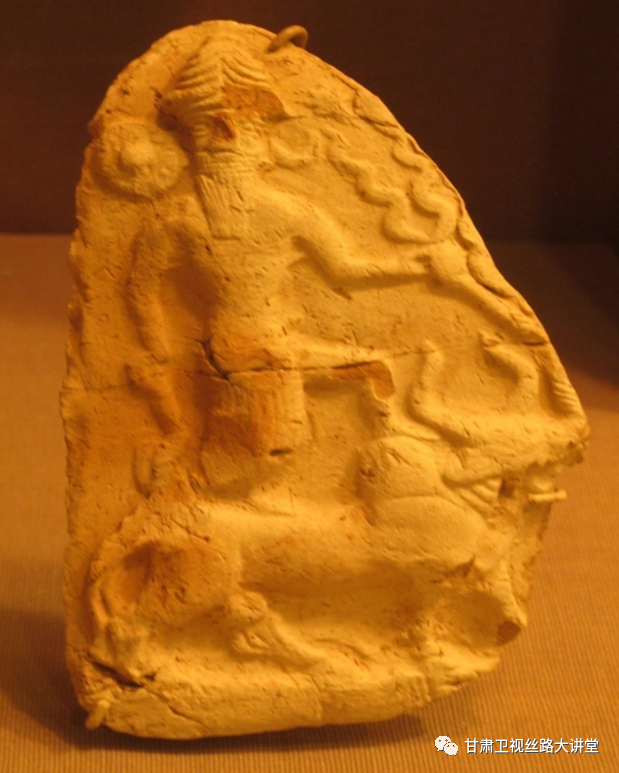 我们看到的这张图片是美国芝加哥大学考古队他们长期就在伊拉克古巴比伦那一带考古,他们就发现了这么一个陶俑,这是我2014年3月份到芝加哥大学访问的时候看他们博物馆,我发现了,我非常兴奋,实际不大。我们看到古巴比龙的风神就站在牛背上,他左手拿的这个闪电后来就演化成湿婆神手时的三叉戟了。