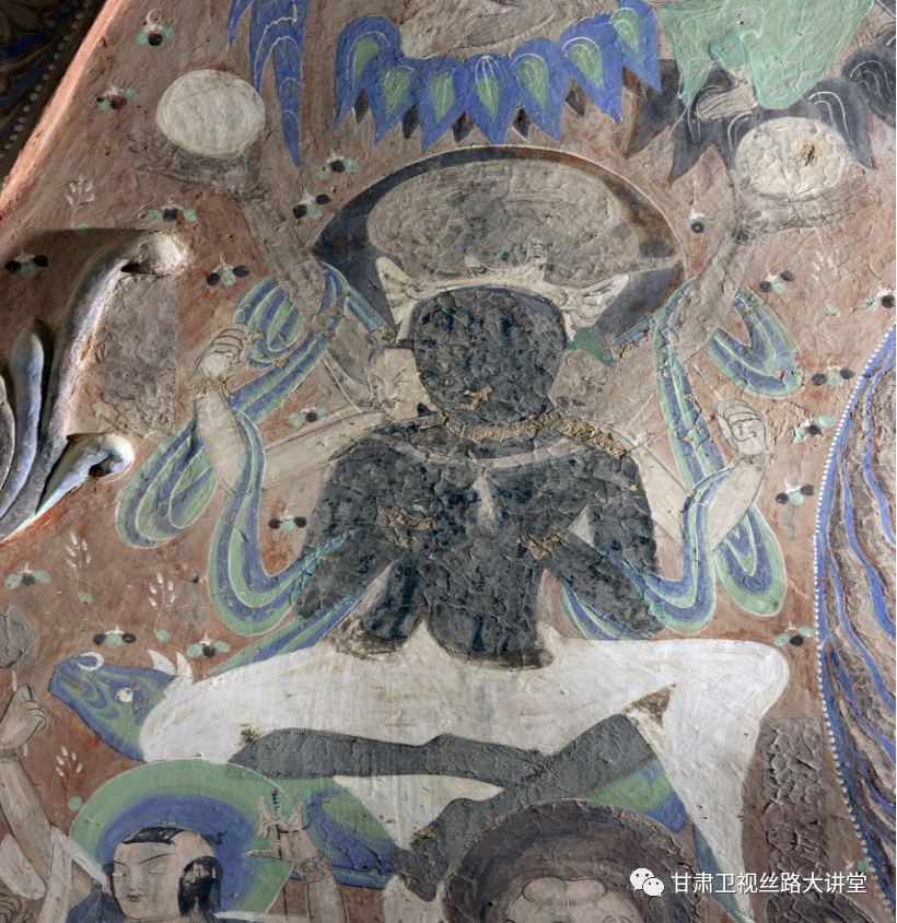 但是这个风神角色,在所有我们今天《大藏经》里面、任何史书记载中关于摩西首罗天功能的记载中都没有看到,所以这又是一个很奇怪的地方,文献描述都没看到这个功能,但是图像中我们看到了。像这样的图像,在敦煌有类似的图像中表现摩西罗的图像中独此一例。在全世界摩醯首罗天图像中拿风巾的,也是独此一例!所以我刚才讲了几个“独此一例”。大家看看这个洞窟它的特殊性、它的这种独创性、原创性又一次体现出来了。