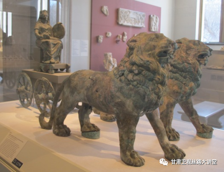 然后再有在希腊神话中有一个城邦的守护女神,叫库柏拉或者希柏拉,大家了解希腊神话的或者希腊艺术的观众就知道,城邦的守护女神希柏拉,她的车子就是有狮子拉的。我们看到这个也是藏在纽约大都会美术馆。这是希腊本土发现的,坐车的就是女神、城市守护女神希柏拉,两只狮子拉的。