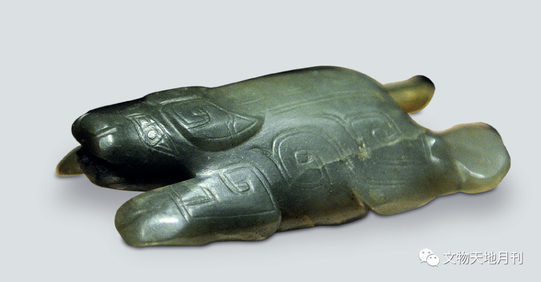 1990年河南三门峡市西周虢国墓地出土有玉牛面(图二二)、玉马面,牛面具上有穿孔,雕刻写实,线条简练。20世纪50~90年代,虢国墓地先后出土有11件牛形玉器。玉牛面外,尚有玉牛首、片状跪卧玉牛、圆雕站姿、卧姿玉牛,造型写实、雕工简练。