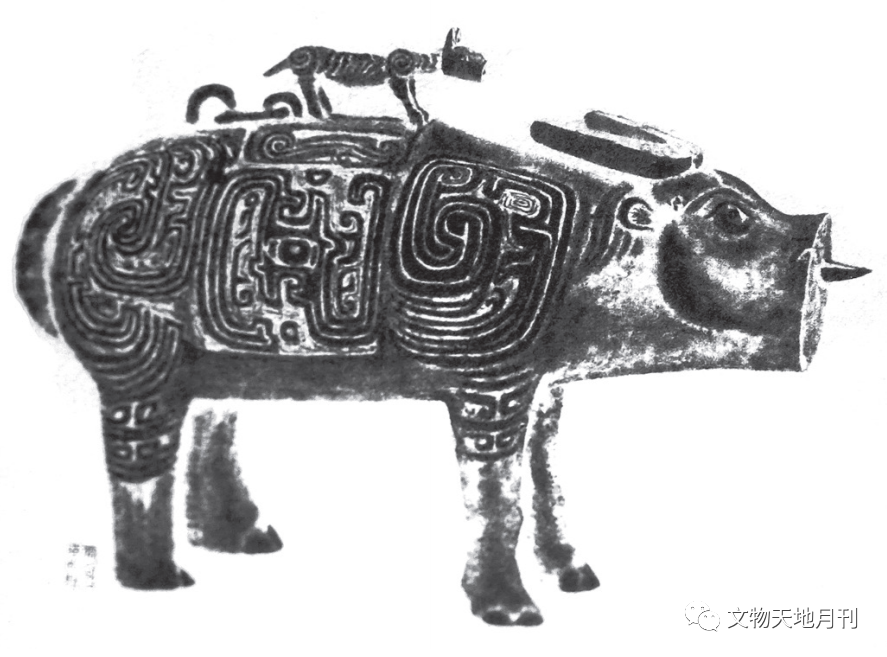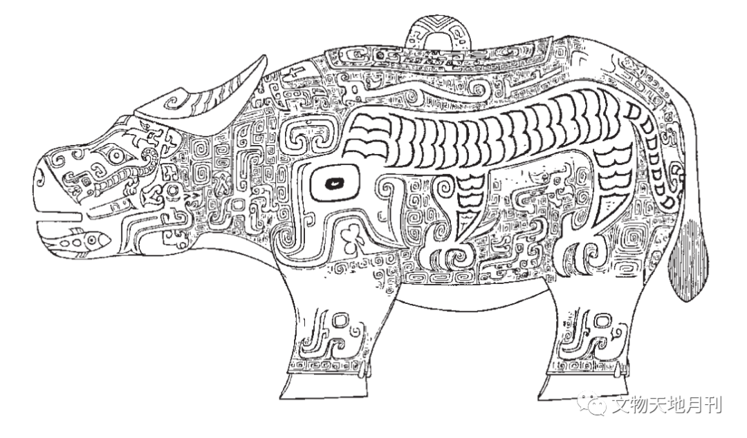 1923年山西浑源李峪出土的东周青铜牛尊(图一〇),牛身纹饰繁复,所铸“饕餮纹”明显源自商、西周青铜器上的牛纹饰,为其常见的变形纹样,牛鼻环显示其或为农耕之牛。此尊造型写实,牛背上开三孔,中间一孔内置小锅,牛腹中空与前后两孔相通,有学者认为是温酒器。