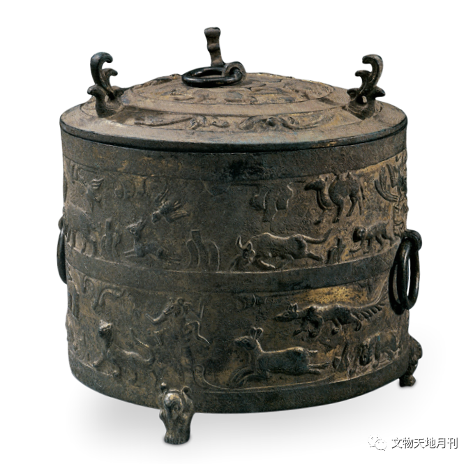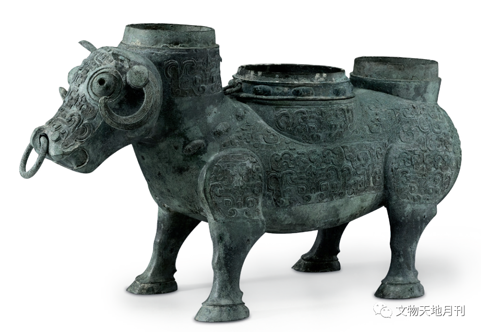 独体牛尊外,青铜鼎、鉴上亦不乏立体牛形象的部件,1923年山西浑源李峪出土的东周青铜鬲鼎盖残器上即铸有一头卧牛,相似品见于1988年山西太原金胜村出土的东周青铜小盖鼎,在鼎盖上以三等分铸三头卧牛,姿态安适悠闲。
