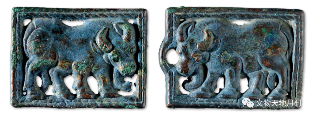 农耕民族的器物注重陈放、储藏功能,游牧民族的用品方便携带,牛纹铜牌饰即游牧民族的代表性物品。2014年宁夏固原市原州区出土的牛纹青铜牌饰(图一九),立牛的形象似水牛,粗腿大脚,弯角向上,体型壮硕。北方草原青铜器牌饰上的牛纹(耗牛形象纹饰多出自西北、北方地区),更多表现的是一种猎杀场面,多以虎、豹、狼噬牛为题材,展现力量与生死博斗的英雄气概,与游牧民族的生活习性相关。