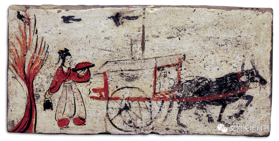 历年考古出土的木牛车(陕西、甘肃、青海等地区常见)、陶牛、陶牛车多为晋至唐制品,且形制多样,分蓬车、敞车两类,前者级别高于后者。“古者自大夫以上皆乘车,而以马为騑服。魏晋以降,迄于隋代,朝士又驾年牛车,历代经史,具有其事。”《旧唐书·舆服制》所载刘子玄的进议证实,其时牛车盛行,或许还有“褒衣博带,革履高冠,本非马上所施,自是车中之服”的原因。陕西等地的唐墓壁画中不乏牛车出行的画面。唐代瓷器烧制工艺技术提升,河南、河北的青白釉、白釉瓷质量上乘,1957年河南三门峡唐墓中出土有青白釉瓷牛车。