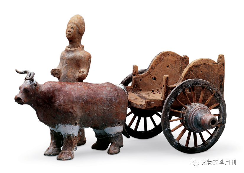 汉初,物资匮乏,马匹稀缺,牛车流行,《史记》卷三十《平准书第八》开篇即言“作业剧而财匮,自天子不能具钧驷,而将相或乘牛车,齐民无藏盖”。东汉晚期牛车渐受重视,《晋书·舆服志》载:“古之贵者不乘牛车,其后……稍见贵之。自灵、献以来,天子至士庶遂以为常乘”,“诸公给……皂轮犊车各一乘。皂轮车,驾四牛,形制犹如犊车……诸王三公有勋德者特加之。”《隋书·礼仪志五》载:“诸王三公有勋德者,皆特加皂轮车,驾牛,形如犊车。”这应是魏晋南北朝牛车盛行的主因。1984年宁夏彭阳县新集乡石洼村出土的北魏陶牛车(图二五),陶质人、牛、车俱全,牛车尚残留部分彩绘,可视为当时牛车的写照。