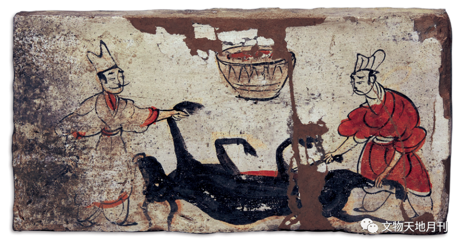 黄河流域陶器上牛的艺术形象在西汉以前少见,东汉渐为流行。从考古出土的木、陶质牛、牛车的数量及分布地域看(西至甘青宁地区,东至山东、安徽地区),汉至唐的日常出行似牛车更为盛行。汉代“牛”文物数量大且分布广,不过主流不再是青铜器,而是陶器,黄河流域贵族墓出土的大量陶牛、陶牛车品种丰富,呈现出了牛的艺术形象由神性转向世俗化:多为耕作、运载。魏晋十六国时期河西走廊的墓葬中发现了大量有关牛的砖画,耕作、放牧、运载(图二三)之外,甚至有屠牛的画面(图二四)。边疆地区的青铜器制品地域特色鲜明,如云南、甘肃、内蒙古等地区,牛的品种也与中原有异。