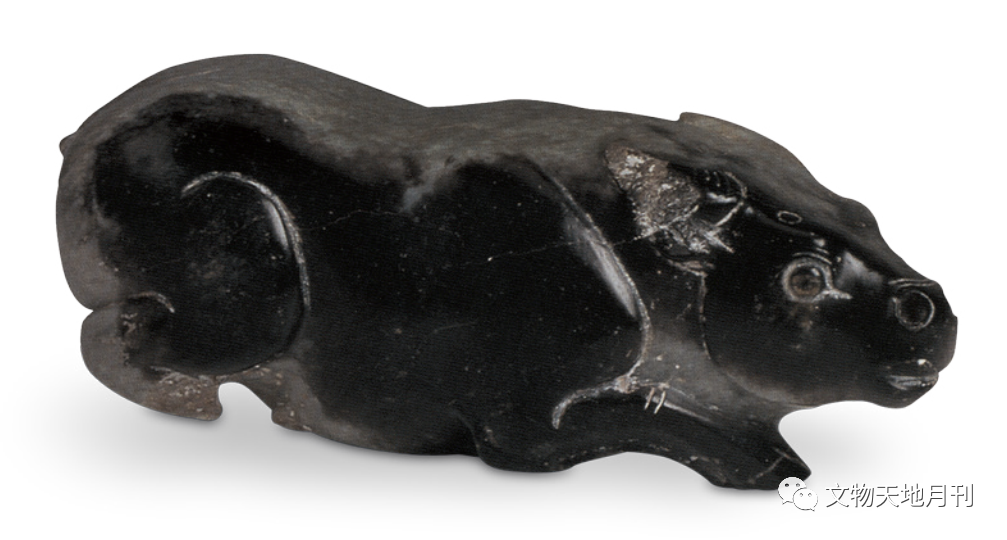 茂陵博物馆所藏西汉元狩六年(前117)霍去病墓石刻中的石卧牛,为我们了解西汉牛的驮运方式提供了实物依据,身长2.6米的石雕卧牛(图二六),体型健硕,从牛背上阴刻的鞍和镫推测,当时牛也用于单独驮载物品。这组石刻被誉为中国“真正的纪念碑性质的成组立体石雕”。考古出土的汉代玉、石雕刻牛,数量不多,多以立体圆雕而成,有立姿和卧姿两种。汉代玉雕牛出土实物不多,尺寸不小(图二七),多为陈设器。