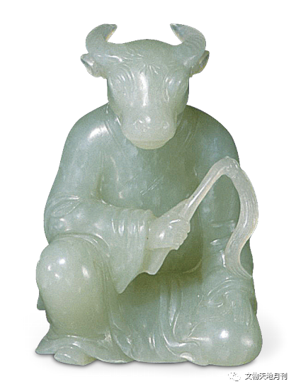 明清宫廷艺术发达,带动了各个艺术门类有了长足发展,特别是清代,以牛、十二生肖为主题的艺术品不胜枚举,具代表者首推圆明园大水法铜雕十二生肖兽首(图三二)、宫廷玉雕十二辰像(图三三)。唐代十二生肖陶俑对清代影响极大,兽首人身的坐像、立像是清代作品的常见样式,工艺更加精细传神。