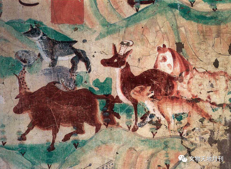 传世的隋唐绘画屈指可数,敦煌壁画可谓填补了这一缺失。敦煌唐代壁画与牛相关的内容非常丰富,唐代323窟绘一幅江南水乡热闹的《迎佛图》场景,水牛与毛驴增添了现实生活的气息。第61窟南壁五代壁画《挽车的牛、鹿和羊》(图三九),表现的是《法华经》中的“火宅喻”。