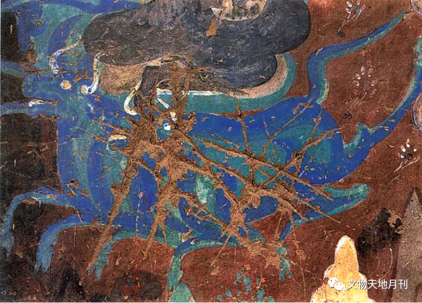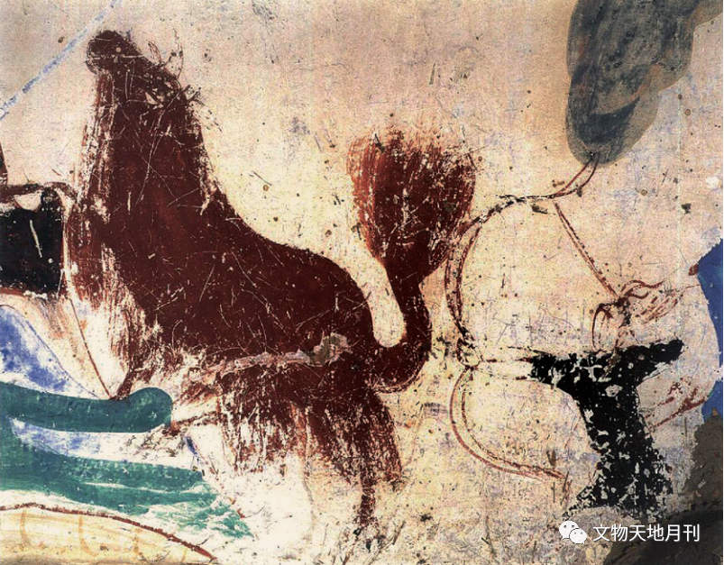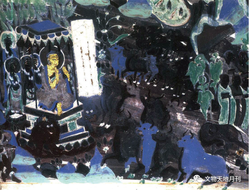 佛教故事中牛的艺术形象,保留较完整、年代较早者首推敦煌壁画,多与故事画、经变画等内容相关。绘制时代最早者可追溯至敦煌北魏壁画,第257窟北壁以石绿打底、石青晕染《奔跑的青牛》(图三五),故事源于佛弟子般特化现出五百青牛。飘逸的牛尾及后蹄,增加了青牛飞腾的神话色彩。该窟北壁上须摩提女缘故事画,表现佛弟子乘五百青牛、孔雀、白马、狮子、大象等赴会,采用“以一当百”的象征手法。早期动物画追求绘画的韵味和故事性,绘画手法受中原汉代绘画影响明显,也融入了西域元素。