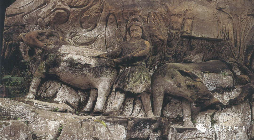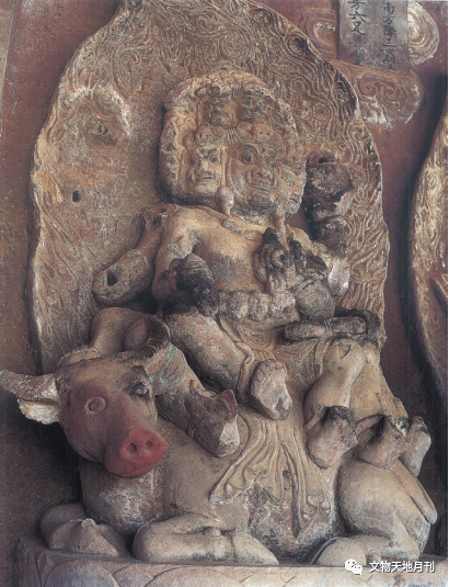 南传佛教也有牛的形象,《南诏图传》中“梵僧七化”故事画中即与牛有关;南诏末期大理国初期的石钟寺区第六号窟现存的六足尊明王(图四〇),其坐骑为一头水牛。