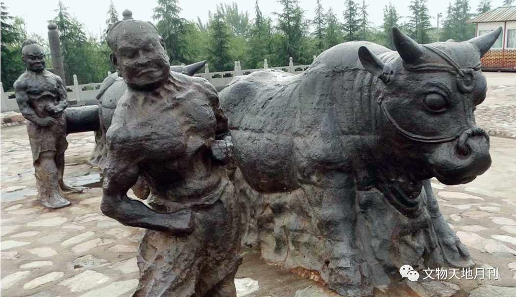晚至春秋时期,牛耕出现,《国语·晋语九》载有“今其子孙将耕于齐,宗庙之牺为畎亩之勤”,“犁牛”一词最早出现于《论语·雍也》:“子谓仲弓曰:‘犁牛之子骍且角,虽欲勿用,山川其舍诸?’”西汉武帝末期政府提出“方今之务,在于力农”的口号,赵过等农学家推新法、提倡新农具,以牛犁耕逐渐普及。陕西、山西、山东等地出土的东汉画像石上有十余幅二牛犁地画面(图四三),汉代文物已经出现犁铧、犁壁等犁具。汉代冶铁技术进步,铁制农耕工具的改进和使用,推动了农业的进步和发展。魏晋时期中原战乱不断,相对较安定的河西走廊砖画墓中出土有相当数量的以牛为主题的画像砖,牛在耕作、畜牧、运载中均为主要角色。仅是耕作一项,在犁地、耙地、耱地中牛都是主力,“二牛一犁”“二牛一耙”“二牛一耱”“单牛单犁”“单牛单耙”等是画像砖常见题材。敦煌壁画也保留了大量魏晋至唐代以此为主题的壁画。